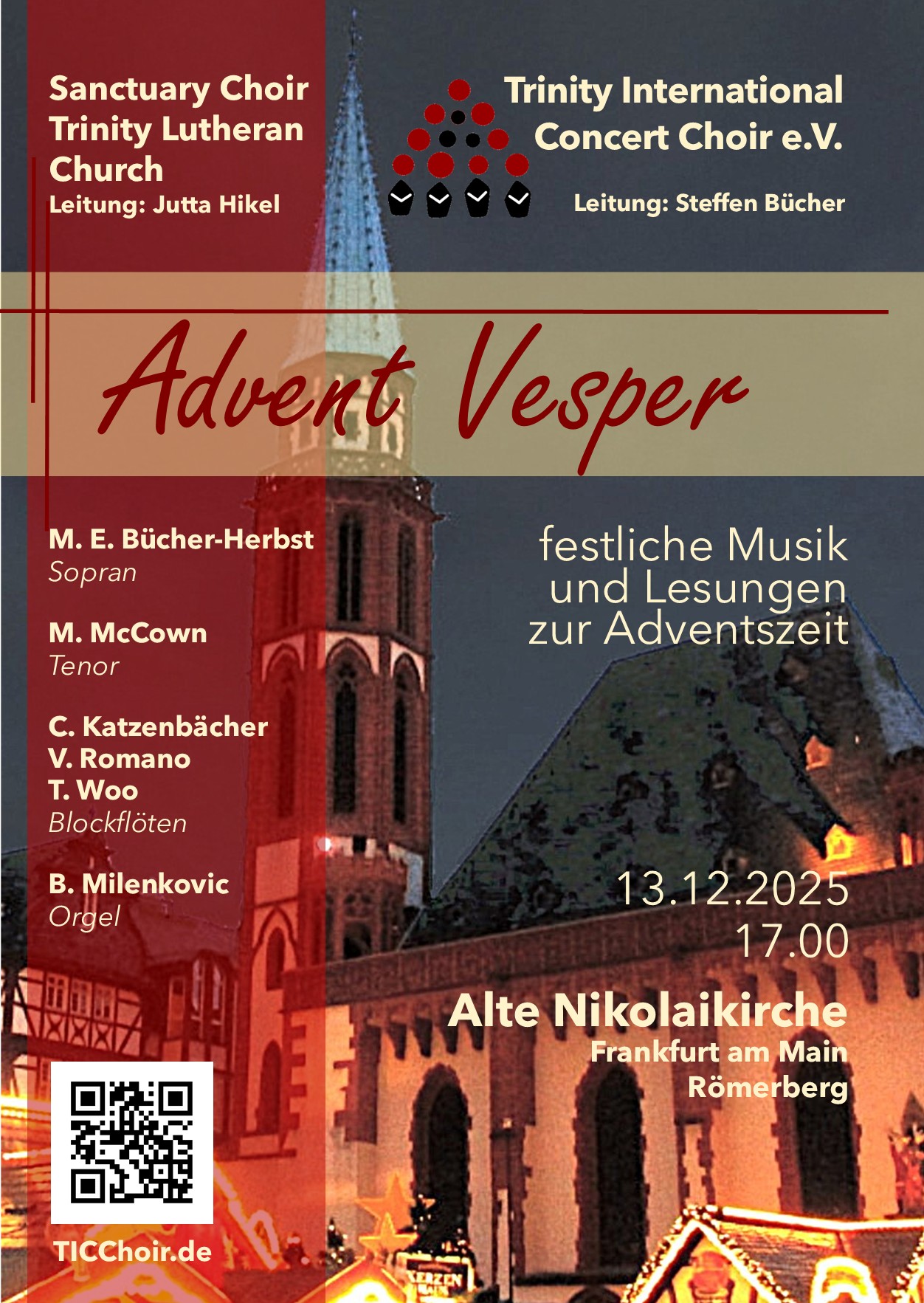 The choir would welcome any and all new singers from Trinity interested in participating in upcoming concerts starting with the joint Sanctuary Choir/TICC Advent musical vesper service on Saturday, Dec. 13 at 17:00 in Frankfurt's Alte Nikolai Church.